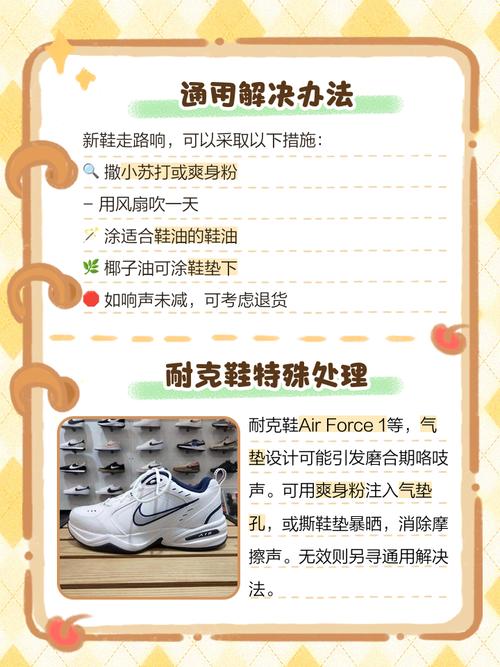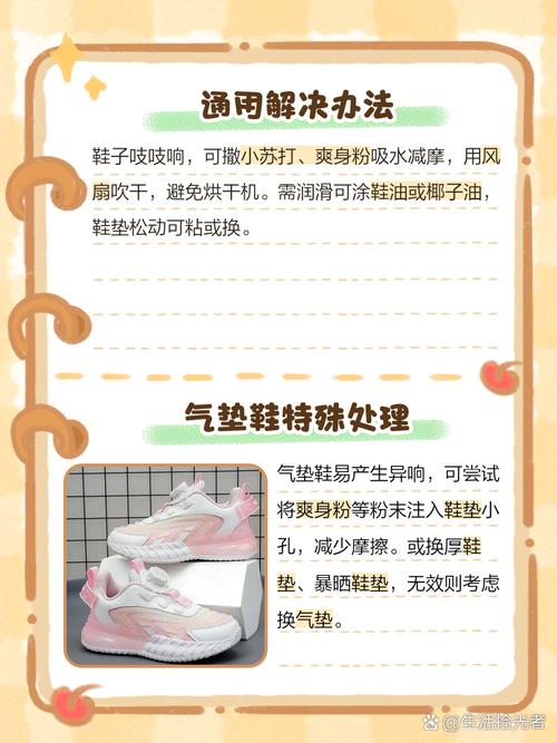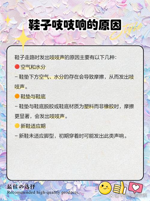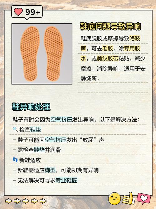 解决办法: 拉槽:如果是塑料或橡胶底的凉鞋,可以尝试用锯条在鞋底轻微地拉几个槽,增加通气性,减少响声。 修鞋店处理:如果是皮质凉鞋或其他材质不易自行处理的凉鞋,建议到修鞋店请师傅在鞋底钉几个牛筋鞋鱼儿,或者在缝隙处补些胶水,以封闭空隙,防止空气进入产生响声。