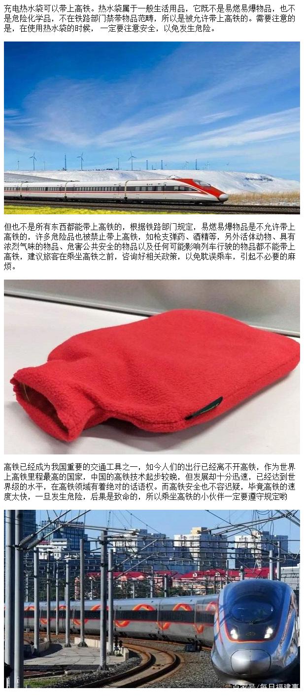 无论是电热水袋还是直接灌水的热水袋,都是可以带上高铁的。因为热水袋不是被禁止或限制的。但是,装满水的热水器不能通过机场的安全检查,需要倒水才能通过安检。途中也不要使用。但是具体的限制和规定要看机场和车站的相关规定。热水袋可以带上高铁,但机场安检是通不过的,毕竟里面有液体和各种配件。