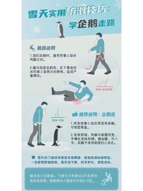 在雪天出行时,特别要注意防止摔伤。由于路面光滑,行走时要小心,以免发生跌倒。如果不幸摔倒,不要剧烈揉搓受伤部位,以免加剧伤情。穿着防滑鞋或旅游鞋等适合雪地行走的鞋子,可以有效减少滑倒的风险。同时,尽量选取人行道或非机动车道行走,以增加安全感。