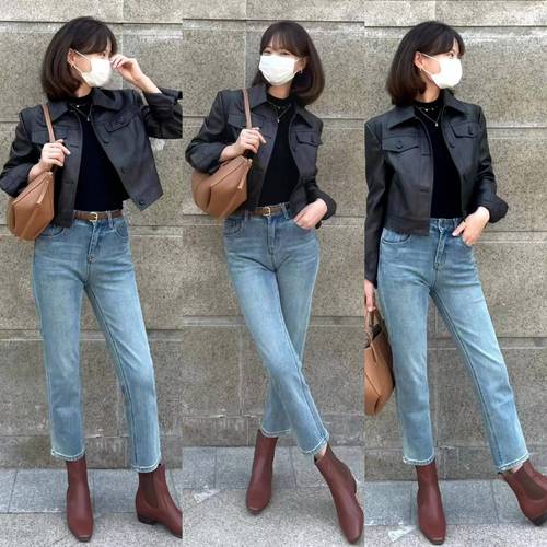 〖Four〗、紧身牛仔裤:紧身牛仔裤因其简洁利落的剪裁,能够凸显身材曲线,与皮衣的硬朗风格形成鲜明对比,增添年轻活力。选取深色牛仔布可以更显瘦且易于搭配各种颜色的皮衣。 破洞牛仔裤:破洞牛仔裤带有一点街头风的味道,这种随性的美感非常符合年轻人的审美。