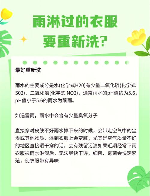 〖Four〗、淋了一点雨的衣服是否需要重新清洗,应根据衣服的材质和淋雨的程度来决定。例如,如果衣服在穿着时被淋湿,且雨水量少,可以不必清洗;如果是皮衣或具有防水功能的衣物,同样不需要清洗。然而,如果是羊毛或棉质衣物,可以进行简单的清洗。