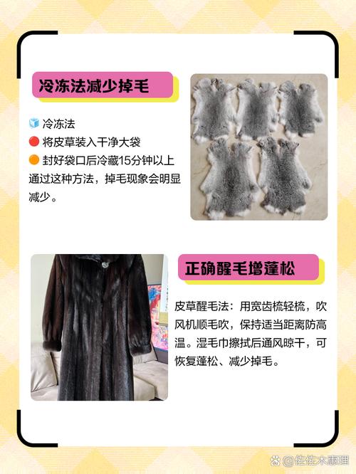 〖Three〗、如何理顺皮草毛发:- 可以使用衣物柔软剂或专用护理剂。将柔软剂喷洒在皮草上,然后用梳子轻轻梳理毛发。- 谨慎使用吹风机,确保温度不要过高,将皮毛均匀铺平后顺时针方向吹拂,同时用毛刷顺毛。- 定期进行专业干洗以保持皮草的最佳状态。