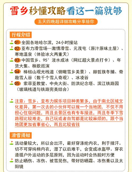 去东北雪乡要准备的衣服装备主要包括以下几类:上身衣物:保暖内衣:作为基础层,能够有效锁住体温。毛衣:提供额外的保暖效果,同时保持舒适。羽绒服或抓绒衣+冲锋衣:羽绒服或抓绒衣提供良好的保暖性能,冲锋衣则具有防风防水的功能,适合在雪地中穿着。下身衣物:保暖裤:作为基础保暖层。