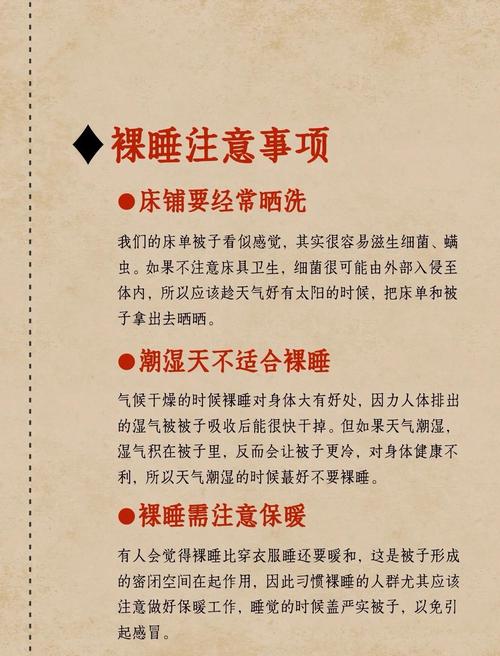 注意保暖:裸睡时一定要注意保暖,特别是夜间温度较低时,避免受凉。调节卧室温度和湿度:保持卧室温度和湿度适中,避免过热导致出汗或过冷导致感冒。床具与清洁:床具软硬度适中:选取软硬适中的床具,以确保睡眠时的舒适度。