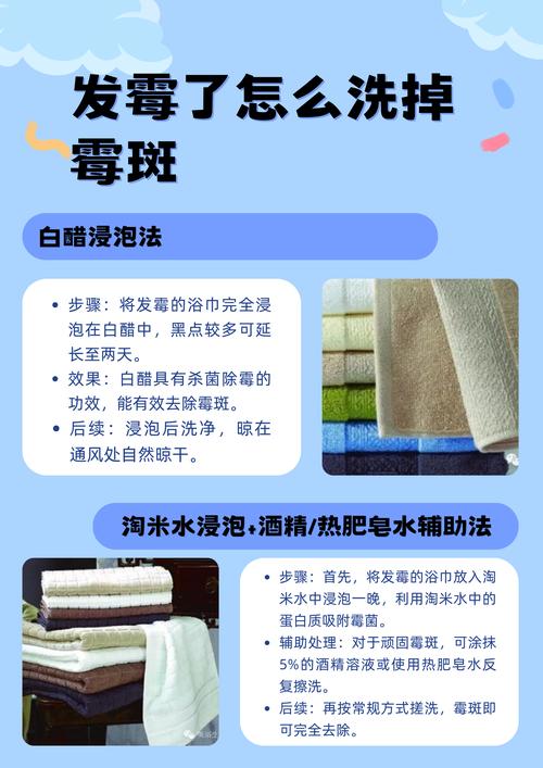 浴巾发霉了,可以尝试以下几种方法洗掉霉斑:绿豆芽揉搓法:将浴巾在太阳下暴晒几个小时。用几根绿豆芽在有霉斑的地方反复揉搓。用清水漂洗干净,霉点即可除掉。再次暴晒几个小时以确保彻底干燥。食盐搓揉法:用食盐在有霉斑的地方搓揉。用清水洗净,可除去湿黏之物。