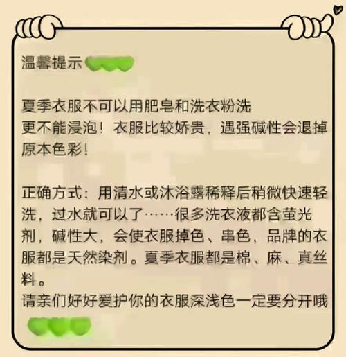〖Four〗、结论:夏天的衣服不建议隔夜洗,因为汗液若不及时清洗,容易在衣物上留下难以去除的斑点,影响清洁效果。对于换下的衣服,处理方法如下: 对于未出汗的衣物,如果只穿了一天且天气炎热,可以挂在通风的地方晾晒两三天,这样不会轻易发霉,特别是春秋季才需要注意防霉。