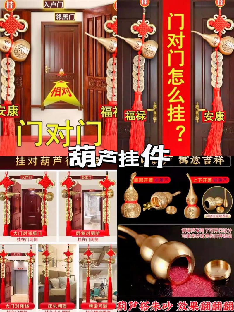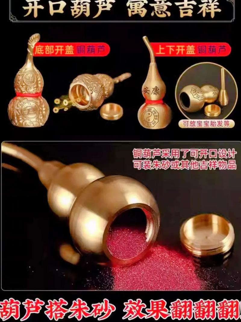 〖Two〗、是好征兆。葫芦装朱砂加强功效的作用,葫芦内装朱砂(取诛杀之意,另朱砂有镇静、安神之药效),是用来驱邪安神的道具,一般都悬挂在门头上方或户门的对面墙上。葫芦里面放朱砂的话就可以加强铜葫芦所发挥的功效了,吸收一切污秽,有很好的辟邪聚阳的作用。