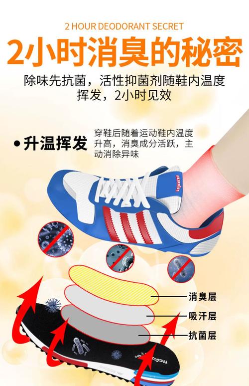 〖One〗、使用婴儿爽身粉 方法:在穿袜子之前,在脚上适量涂抹婴儿爽身粉。 效果:婴儿爽身粉可以吸收脚部多余的水分,帮助脚部保持干燥,同时抑制臭味。 使用干鞋电热片 方法:将干鞋电热片放入鞋子中,根据需要调整使用时间。 效果:干鞋电热片能够快速加热并去除鞋子内的湿气,特别适合在鞋子潮湿时使用。