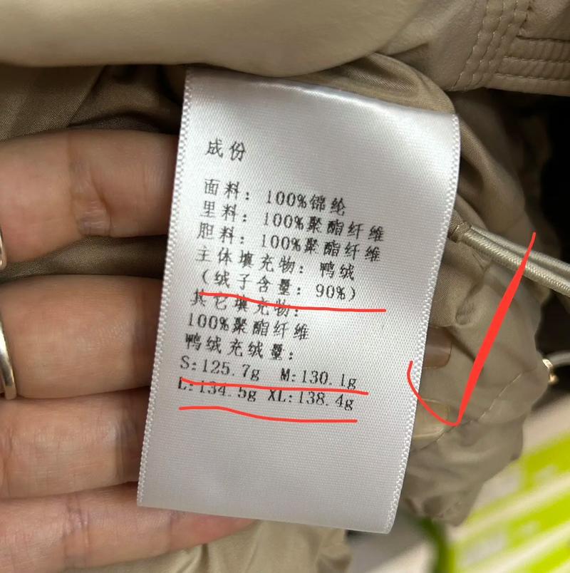 〖One〗、要想看明白新国标羽绒服吊牌,可从以下关键信息入手。查看“基本信息”,这里会标注品牌、型号、规格等。规格包含尺码,对照自身实际情况选取合适衣服。关注“填充物”。新国标规定需明确标注填充的是鸭绒还是鹅绒,以及绒子含量。绒子含量越高保暖性越好,例如绒子含量 90%的羽绒服,保暖性能通常优于 70%的。