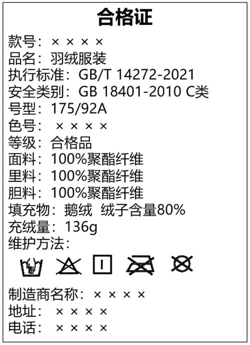 〖Three〗、查看新国标羽绒服吊牌,可关注以下关键信息。先看基本信息,品牌、型号、规格等会清晰标注,了解衣服款式与适合尺码。重点关注含绒量、绒子含量和充绒量。