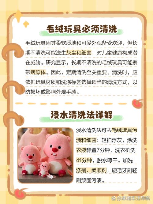 〖Two〗、用软刷擦洗:如果玩偶上有比较顽固的污渍,可以用软刷轻轻地刷一刷。刷完之后,记得给玩偶总结总结毛发,然后在通风的地方晾干哦。用水和清洁剂清洗:也可以准备一块海绵,蘸上一点清洁剂,然后轻轻地擦拭玩偶。对于有严重污渍的地方,同样可以用软刷来帮忙。