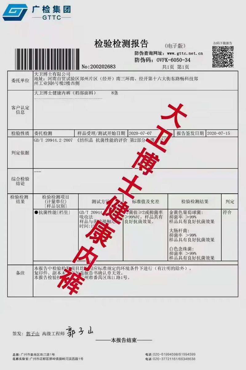 〖Four〗、大卫博士内裤的检测报告可以通过以下方式看真伪: 看检测报告的出具机构。如果是正规的第三方权威机构或者有资质的实验室出具的报告,那么其可信度应该是比较高的。但是如果是没有权威性或者资质的机构或者实验室出具的报告,那么其可信度就值得考虑了。
