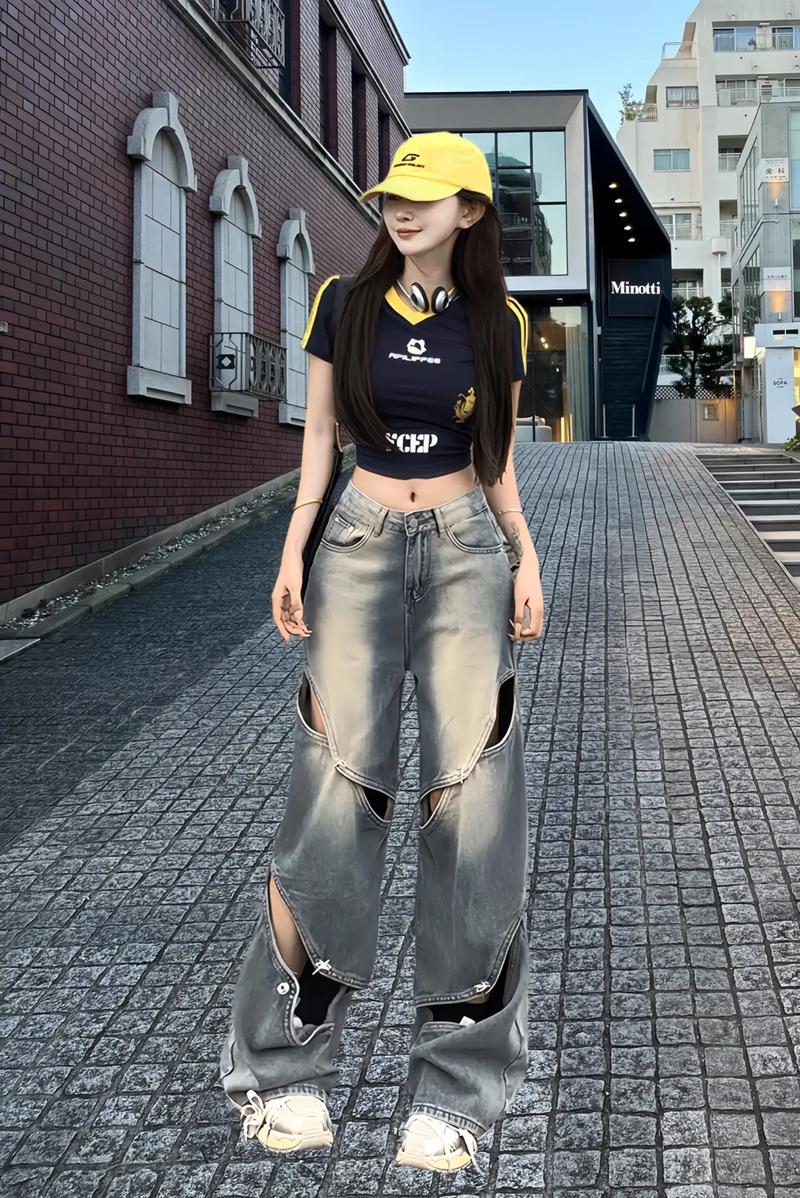 在选取破洞裤的上衣搭配时,应考虑与之作对比或相互协调的款式。例如,破洞裤与棒球服的搭配能够带来青春活力;与简约的牛仔衬衫搭配则显得时尚而复古,非常适合追求潮流的人士;而与宽松的毛衣搭配则显得简约而不失大气,而且几乎任何颜色的毛衣都能与之和谐相配。