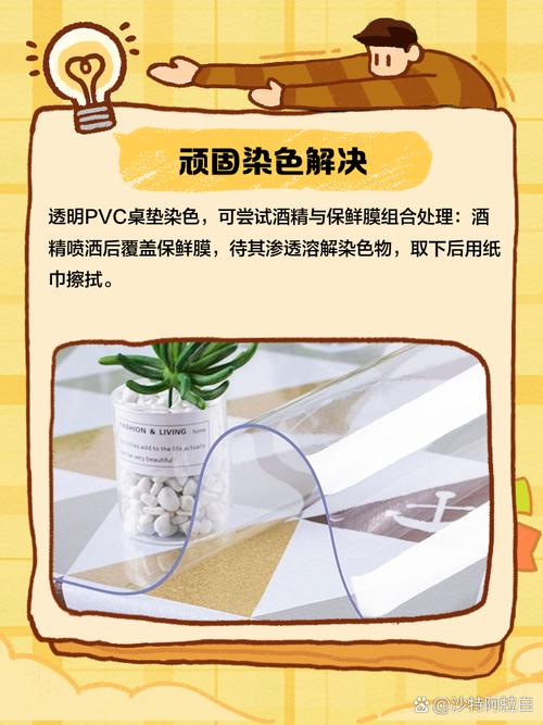 透明PVC桌垫上的染色可以通过以下几种方法清理:使用酒精、洗发水或白醋:酒精擦拭:将抹布浸泡在酒精中,然后用其擦拭染色的地方,多擦几下通常可以去除染色。洗发水与白醋结合:如果染上的是如西瓜汁等较难清理的污渍,可以将洗发水涂抹在染色处静置一段时间,随后用蘸有白醋的水刷洗,通常可以去除染色。