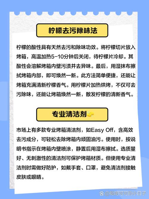 〖Three〗、去除烤箱中的油哈味,可以采取以下几种方法:使用柠檬水或白醋水:步骤:将一碗柠檬水或白醋水放置在烤箱中,然后用约100℃的温度进行干烧,持续10分钟。效果:此方法能有效去除烤箱中的异味。清洁烤盘:步骤:烤盘冷却后,倒入温水并加入少量洗洁精,然后将烤箱设置为热风循环模式,持续10分钟。
