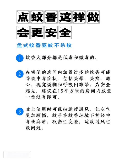 安全使用蚊香,避免潜在风险: 睡觉前半小时是使用蚊香的理想时间。使用时应确保门窗关闭,并让室内人员及宠物离开。 比较好在户外使用蚊香,如住宅周围、门口或通风良好的区域。在傍晚时分或天黑前点燃蚊香效果最佳。 避免将点燃的蚊香靠近头部,减少烟雾吸入。