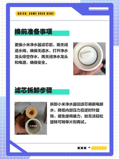 拆洗小米净水器滤芯的步骤如下:准备工作 准备工具:扳手、滤芯拆卸工具、清洗液以及厨房纸巾等。 关闭水源:在操作前务必关掉水源开关,避免水流冲击造成伤害。拆卸滤芯 松开螺丝:用扳手松开小米净水器上的螺丝。 取下外部盖子:将小米净水器的外部盖子拿下。