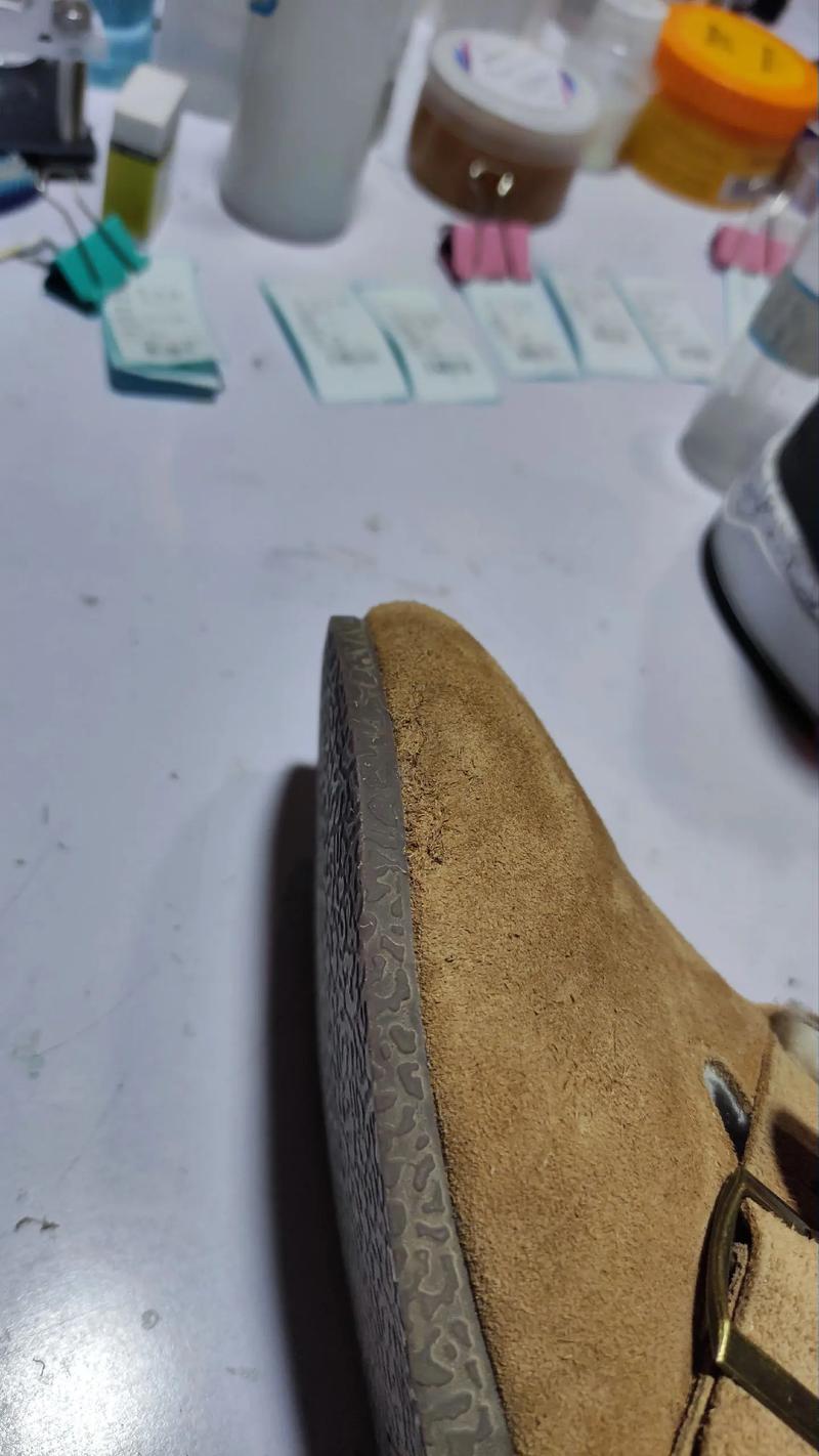 〖Four〗、使用绒面修复剂:对于较浅的划痕,可以喷上适量的绒面修复剂。擦拭均匀:使用刷子或绒布反复擦拭,让修复剂均匀渗透到划痕的深处和鞋面内部。吹干:将鞋子放在室内通风的地方吹干,确保修复剂完全干燥。严重划痕处理:寻求专业帮助:如果划痕比较严重,建议拿到专业的修鞋店进行处理。
