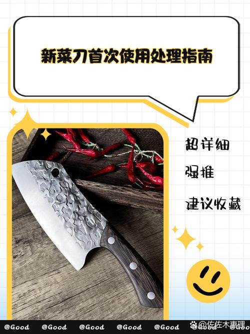 开刃:新菜刀买回后要找专业磨刀师傅“人工手磨”来开刃,千万不要用砂轮来飞磨,否则会发热退火,刀刃变软而报废。清洗:先用开水清洗一遍,然后用磨刀石磨开口,磨快后用清水再洗净,用干抹布抺干。消毒:一般情况下可以用消毒柜消毒,或者是用酒精消毒。遵循这些步骤可以确保新刀在使用时既锋利又安全。