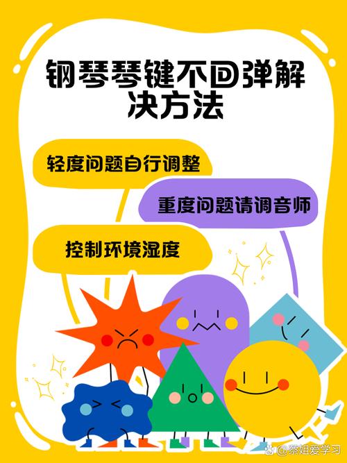 钢琴键弹不起来,可以通过自行装上和调整毛毡帘于适当的位置来解决。以下是具体的原因分析和处理建议:原因分析: 材料受潮:钢琴的上下运作转动点由呢毡圈裹着申达针替代,而管制呢毡的轴架是木材制成。黑、白键前端底面长方形扁销钉孔和琴键中处定位孔的呢毡,以及琴键本身都极易受潮。