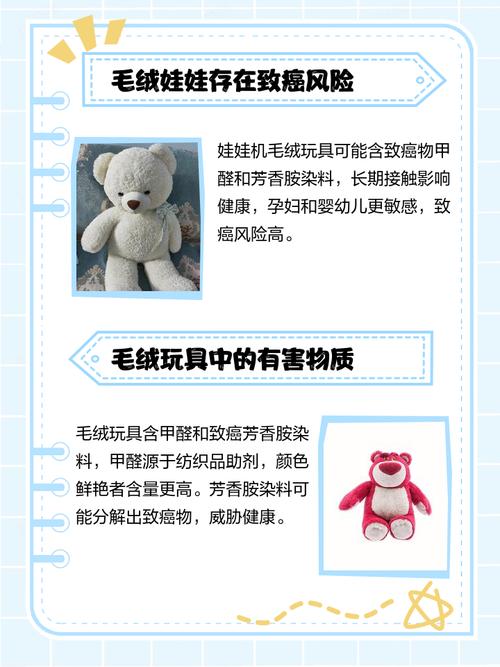 毛绒玩具对宝宝的危害主要有以下几点:诱发敏感症:不合格的毛绒玩具容易吸附灰尘、隐藏细菌和甲醛等有害物质。宝宝接触这些玩具时,可能会诱发敏感症,如拉肚子、肺部感染等。如果多个小孩接触,还容易造成交叉感染。