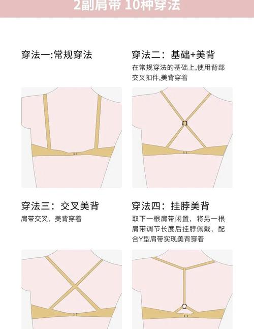〖Three〗、单肩穿法:选取可以去肩带的内衣,去掉其中一根肩带,使其适合单侧露肩的衣服,避免肩带外露的尴尬。 单肩交叉法:对于单肩设计的衣服,可以将一根肩带的一端在胸前固定,另一端斜跨至另一侧肩部,创造一个独特的肩带位置。
