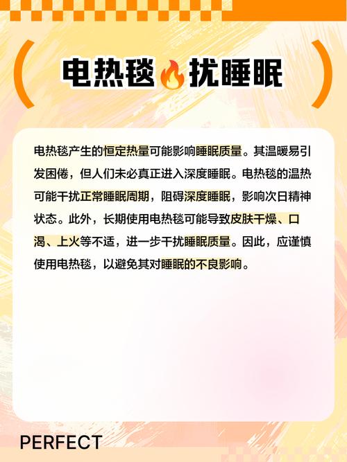 〖One〗、降低抗寒能力:长期依赖电热毯取暖,会降低女性的抗寒能力,使得体质更加虚弱,不利于身体健康。影响睡眠质量:电热毯温度过高会降低睡眠质量,使得第二天起床后感觉精神不佳。安全隐患:电热毯长期使用且保养不当,可能会存在漏电风险,因此不建议在睡觉时持续使用。