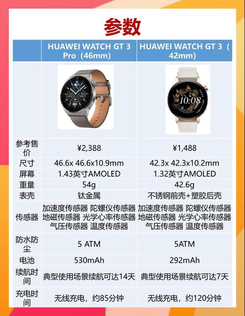 〖Three〗、华为watch gt4内置扬声器,可能支持更多音频输出功能。华为gt3 pro则没有内置扬声器。电池容量和续航时间:华为watch gt4的电池容量为524mAh,标准续航时间为8天,极限续航时间为14天。华为gt3 pro的电池容量较小,为292mAh,标准续航时间为7天。