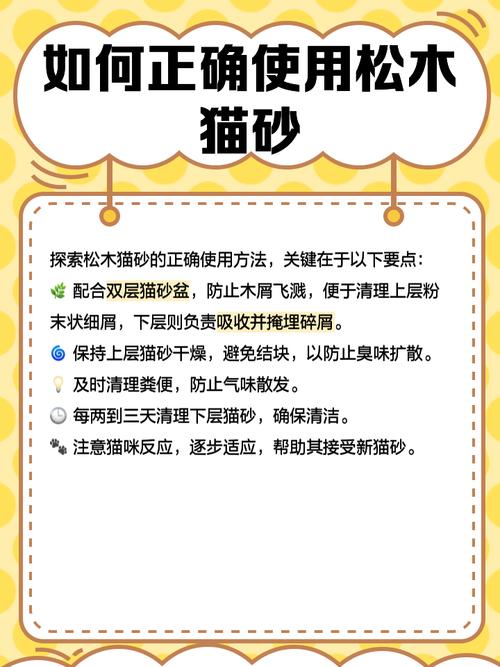 〖Two〗、松木猫砂的使用方法主要包括铺设、清理和更换三个步骤:铺设松木猫砂:选取一个大小合适的猫砂盆,确保猫咪有足够的空间舒适地排泄。在猫砂盆底部铺设一层厚度为35厘米的松木猫砂。初次使用时,可在猫砂盆的一个角落多放一些松木猫砂,以引导猫咪习惯在此排泄。