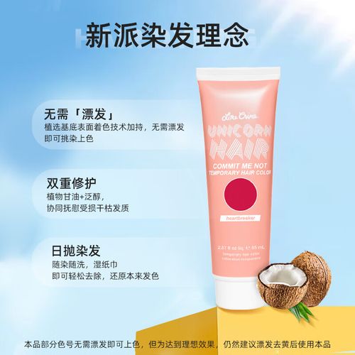 〖Four〗、安全性:该染发膏使用起来相对安全,对头发的伤害较小。使用后,头发不易出现损伤,也不会导致头皮痒或头皮疼,且没有异味。颜色:独角兽染发膏的颜色丰富且大胆,适合想挑战自我的人群。由于颜色比较靓丽,需要先褪色,使用漂粉把头发褪色后再染发。