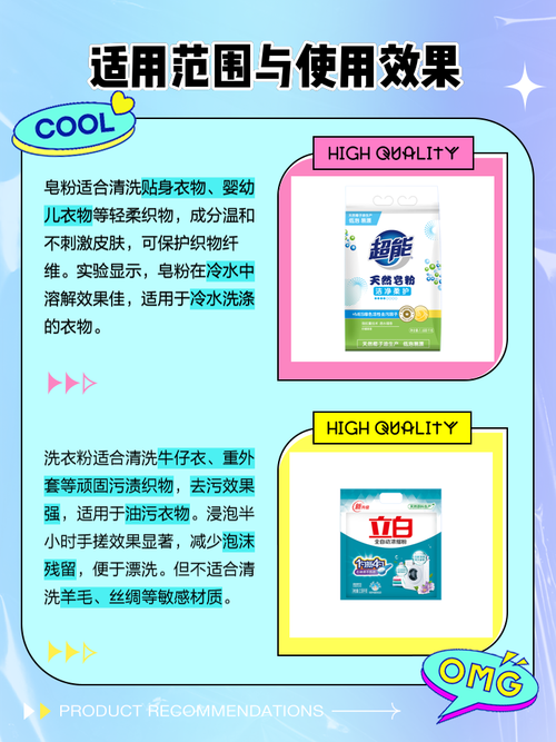 〖Two〗、其次,肥皂粉和洗衣粉的适用性也有所不同。肥皂粉由于其温和的性质,更适合对衣物进行细致的清洁,特别是对于那些需要特别护理的衣物。相对地,洗衣粉由于其较强的清洁能力,更适合清洗那些较为脏污的衣物。最后,肥皂粉和洗衣粉的性质也有所区别。