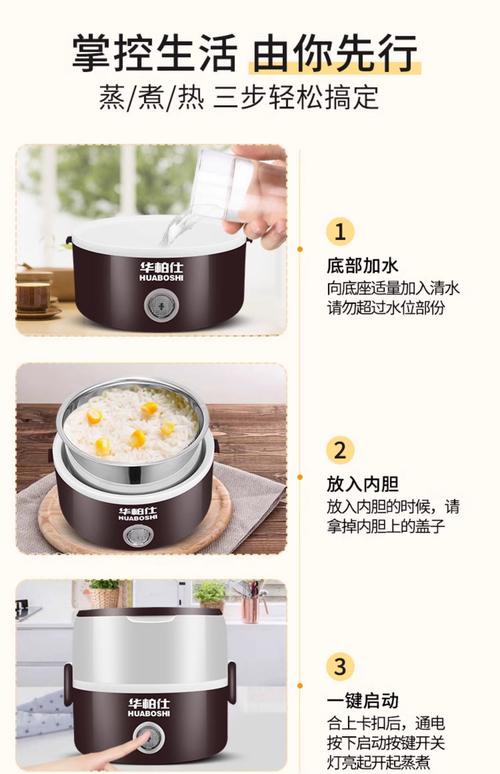 〖One〗、等待大约15至20分钟,直到米饭熟透即可。使用电热饭盒蒸米饭的步骤: 准备食材:- 加热饭菜:使用量杯向电热饭盒内加入适量水,将食物连同配套的饭盒或菜盘放入机体,封闭上盖。- 蒸煮米饭:同样用量杯加入适量水,将生米和水按比例倒入子饭盒中,再放入机体,盖上外壳上盖。