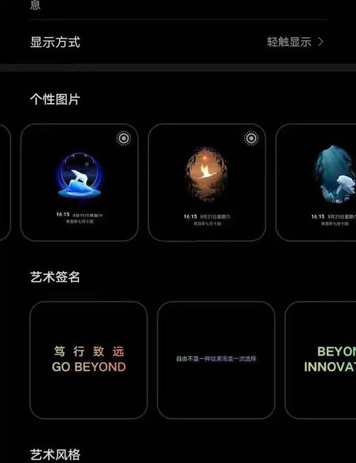 〖Three〗、开启灭屏显示功能 - 导航至“设置”菜单,选取“桌面和壁纸”。- 进入“灭屏显示”选项,开启“灭屏显示”功能。- 可选:设置灭屏显示的具体时间范围或选取“全天显示”。 设置灭屏时钟样式 - 在开启灭屏显示后,选取“时钟样式”选项。- 左右滑动浏览不同的时钟样式。
