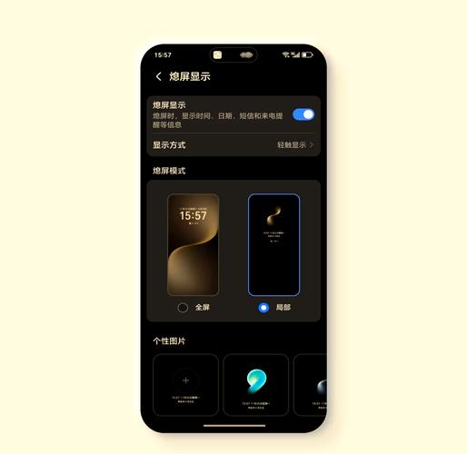 〖Four〗、进入设置 桌面和个性化 熄屏显示,选取喜欢的熄屏显示。设置全屏熄屏显示 您可将当前手机使用的锁屏壁纸设置为全屏熄屏显示,体验更完整更好看的熄屏效果。在熄屏显示界面,选取全屏样式。根据需要开启或关闭显示通知和电量。点击应用。注:全屏熄屏显示会根据锁屏壁纸变化。
