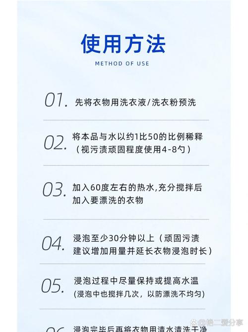 洗衣:每10kg干衣物加入本品30『5』0g,洗衣温度30『5』0℃,可以与洗衣粉,洗衣液一起加入,洗涤10『2』0分钟。去渍除斑:根据污渍情况,用40『6』0℃温水,按1『2』%浓度,即^1kg水中加入10『2』0g本品,充分搅拌溶解后,浸泡衣物,污渍除掉后,用清水投洗干净。