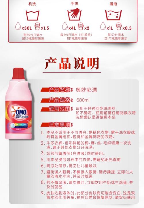 不可混用:彩漂粉不可与含氯漂白剂同时使用。加热要求:使用时需加热到80℃以上。安全防护:对皮肤具有刺激性,比较好戴上胶手套操作。触摸后请洗手,切勿触及眼睛。如溅入眼睛,应立即用大量清水冲洗,严重者需去医院治疗。按照上述方法正确使用彩漂粉,可以有效漂白和杀菌,同时保护织物不受损伤。