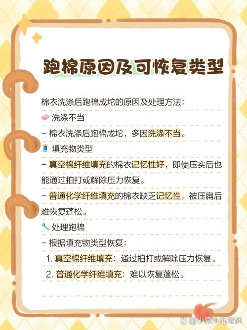 〖Two〗、衣服跑棉的解决办法主要有以下几种:寻求专业人员帮助 可以将跑棉的棉衣送至服装店或改衣店。让专业人员为棉衣加一层里衬,这样可以有效防止棉花继续跑动,如果处理得当,甚至可以彻底解决跑棉问题。