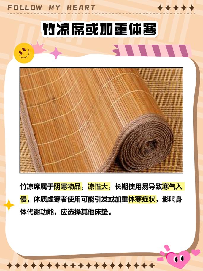 〖Three〗、竹席竹条错位了还能不能用?竹席竹条错位了驾驶能够使用的,我们可以用熨斗或是一些比较重的物品压一下,过一段时间后他就可以恢复成原样了。凉席对折睡要注意什么?席子比较好不要选用草席,一般来说,用绳子、芦苇、稻草编织的席子轻易使人过敏,而用竹、藤制成的席子则较少过敏者。