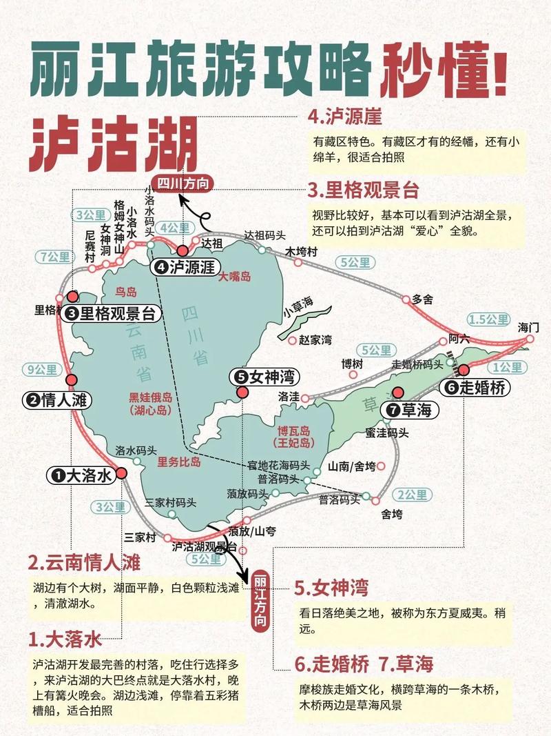 泸沽湖的旅游景点非常丰富,以下是一些值得一游的地方: 格姆女神山:泸沽湖四周比较高的山峰,摩梭人每年转山节时都会上山祭祀女神。站在山上,可以欣赏到泸沽湖的全景。 湖心岛屿:黑瓦吾岛、里务比岛和皮余里格岛等是野鸟野鸭的栖息地,也是昔日永宁土司阿云山总管的水上行宫。