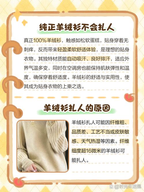 〖Two〗、羊绒衫扎人主要有以下三个原因:纯度不高:羊绒衫如果扎人,可能是其纯度不高,即羊绒的含量较低。一般纯羊绒衫不容易扎人,而不纯的羊绒衫中可能混入了其他材质,导致穿着时感觉扎人。通常,羊绒含量低于70%的羊绒衫扎人现象会比较明显。