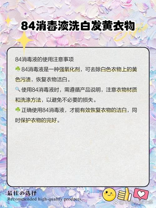 〖Three〗、- **操作方法**:如果衣服是白色的,可以重新稀释84消毒液漂洗衣物,但要注意控制浓度和时间,避免再次变黄。- **原理**:稀释后的84消毒液可以去除残留的黄色污渍,但需要谨慎使用,避免过度漂白。