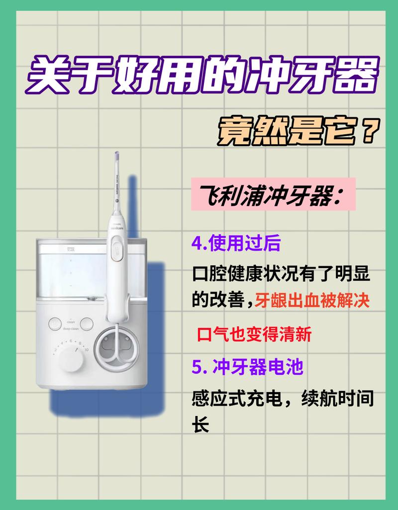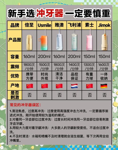 〖Three〗、首先,我们来看一下冲牙器的好处:有效清洁:冲牙器可以深入牙齿间的缝隙,清洁普通牙刷难以触及的地方。这对于预防牙周病和蛀牙非常有帮助。保护牙龈:正确的使用冲牙器可以按摩牙龈,促进血液循环,有助于保持牙龈健康。方便使用:冲牙器易于操作,只需几分钟就可以完成整个口腔的清洁。