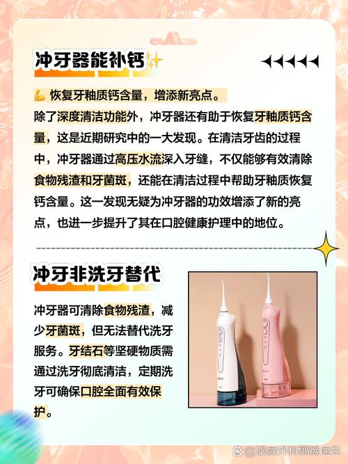 对于那些有蛀牙、牙龈炎或牙周炎的人来说,定期使用冲牙器可以有效缓解症状,改善口腔健康状况。然而,冲牙器并不完全替代电动牙刷的功能。电动牙刷通过超声波震动技术,能够更深入地清洁牙齿表面,提高清洁效果。因此,建议大家在饭后使用冲牙器清洁牙缝和牙龈沟,在早晚使用电动牙刷进行常规清洁。