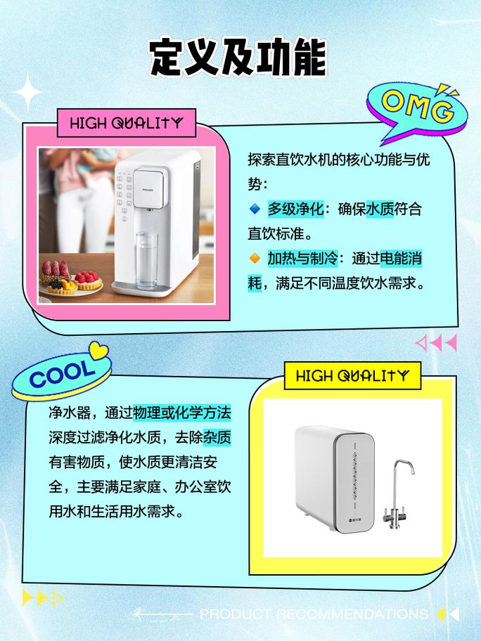 〖Three〗、预算够的话,净水器和直饮水机可以一起买。具体来说:净水器的特点:净水器一般没有加热功能,制出的水是常温的。在冬季低温或夏季炎热时,饮水可能会比较困难。净水器通常需要和管线机搭配使用,但对于没有提前埋线或厨房空间狭小的用户,安装上可能会有一些困难。