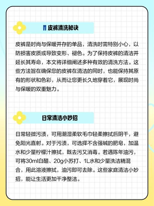 〖Two〗、皮裤的清洗和保养方法如下:清洗方法: 去除灰尘:先使用温热的毛巾或者海绵轻柔擦拭皮裤表面,去除灰尘。这样可以使污渍受热后更容易清洗,同时避免损坏皮质。 清洗污渍:在清水中滴加78滴白醋,用软布蘸取后轻轻擦拭污渍。对于顽固污渍,可以使用蛋白进行擦拭。避免使用硬毛粗毛的刷子,以免损坏皮革表面。
