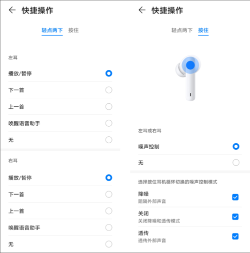 长按耳机杆,切换噪声控制模式(降噪、透传、关闭三种模式)。进入智慧生活APP:降噪模式下可对降噪方式进行调整:智慧动态:耳机结合外界噪声情况,自动调节合适的降噪方式。轻度:适合图书馆,书店,办公室,等噪声较低的场景。均衡:适合咖啡厅,路边漫步,巴士等中等噪声场景。