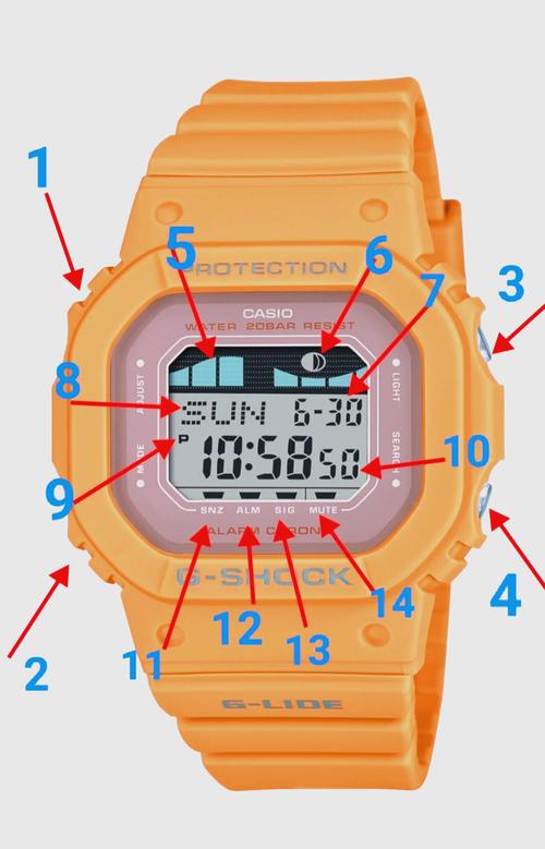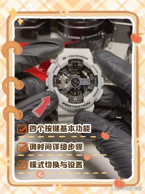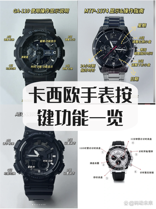 〖One〗、卡西欧手表的四个按键功能图解如下: 左上键:通常标有“ADJUST”字样,中文意为调整。在默认界面下,轻按此键可以查看所在地世界时间。若长按,则进入时间设置菜单,允许您调整各种时间相关设置,如世界时间、倒计时、闹钟时间等。在任意二级菜单中,轻按此键可退出当前设置。