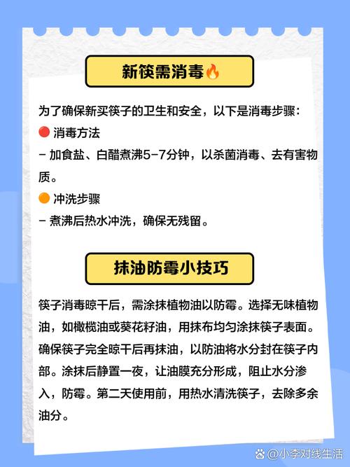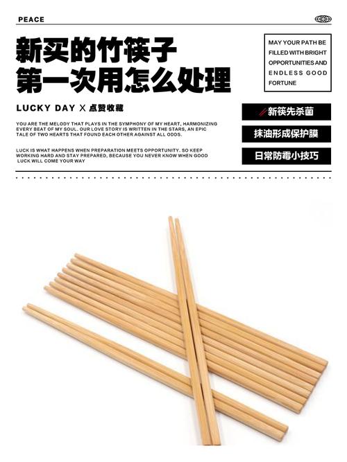 〖Two〗、新买的筷子有味,可以采取以下步骤处理:清洗筷子:首先,使用洗洁精将新买的筷子仔细清洗一遍,以去除表面的污垢和油脂。盐水消毒杀菌:接着,将筷子放入盐水中煮开。盐水具有良好的消毒杀菌作用,可以有效去除筷子上的细菌和其他微生物。