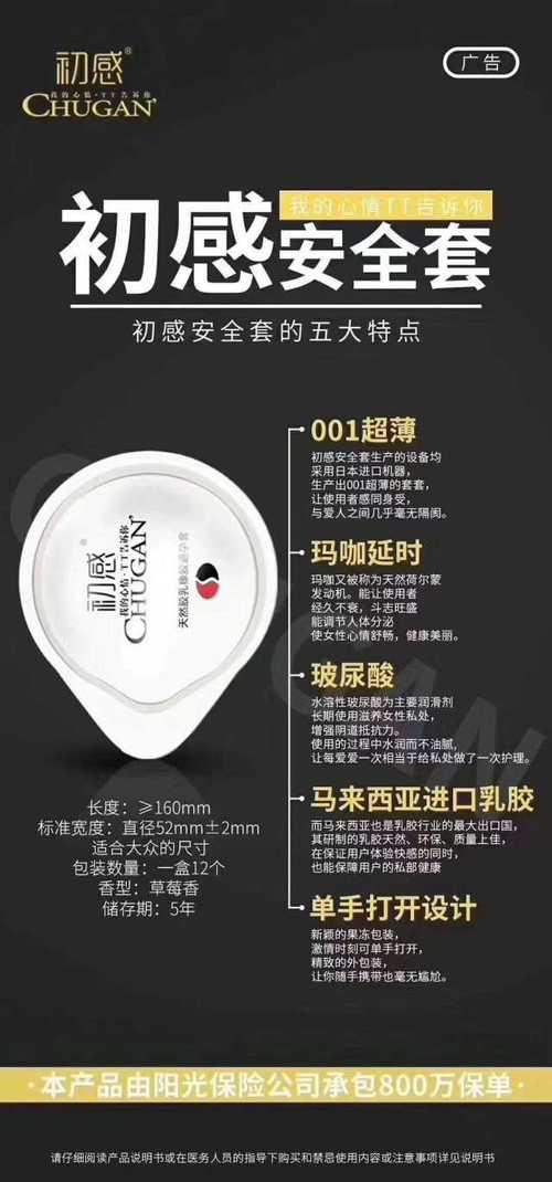 初感001玻尿酸避孕套,采用进口优质乳胶,超薄设计,配合水溶性玻尿酸成分,提供舒适的裸入体验。同时,添加了玛咖延时精油成分,延长爱爱时间,提升双方的满足感。金枪哥2代延迟喷剂,使用天然成分萃取,不含西药,有效延时20『8』0分钟,持久不麻,且无副作用。平安保险承保一千万,安全可靠,可放心使用。