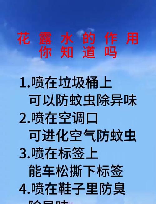 〖Four〗、花露水的主要作用包括驱蚊止痒、消毒杀菌、去除异味以及作为衣物清新剂。 驱蚊止痒:花露水中含有驱蚊成分,如柠檬桉叶油等,这些成分能有效驱赶蚊虫,避免蚊虫叮咬。同时,花露水还能缓解因蚊虫叮咬引起的皮肤瘙痒和红肿,起到止痒的作用。